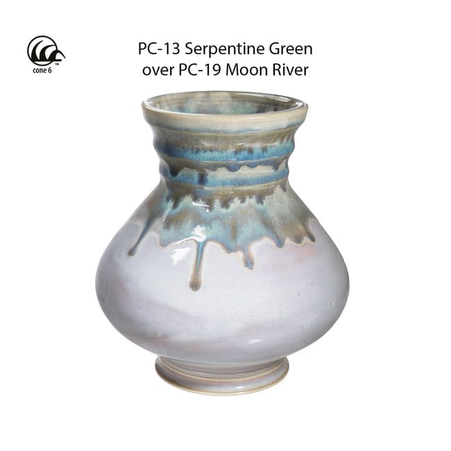 PC-13 Serpentine Green is a semi-matte soft green glaze that breaks light blue over texture. Serpentine Green layers well with other Amaco Potter’s Choice, Celadon, and Satin-Matte glazes.