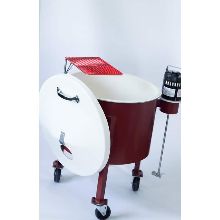 The glaze is thoroughly mixed in a matter of seconds. The cone bottom fiberglass tank is 22″ deep and there are no edges or corners for the glaze to build up.