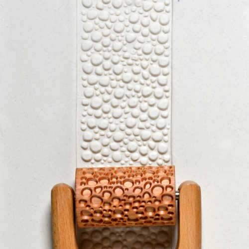 The RL Large Handle Roller has a rolling design face that is 6 cm (2.4 inches) across. The RL Roller creates a detailed pattern in clay. For best results, roll the RL roller with an RH-1 Handle.