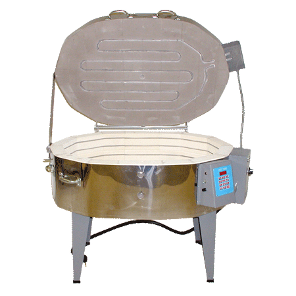 Glass firing oval kilns are designed for large workloads and unusual shapes that do not fit in a cylindrical or square shape kiln and are used for fusing, forming glass shapes, and heat-treating. 240-208-volt glass fusing models are equipped with a lid element for the fusing segment of the glass firing and body elements for the ramping up-down and annealing segments of the firing. An infinite switch controls the intensity of the heat coming from the lid element. If the switch remains in the OFF position, only the body elements will heat the kiln. If the infinite switch is turned to the High position, all elements, both body and lid, heat at the same intensity. The kiln operator may choose to lessen the intensity of the lid element by turning the switch down. Models come equipped with pilot light, 18″ tall metal stand or frame, stainless steel jacket, lid lift assist, peephole plugs, instruction manual, and warranty card. Two-year warranty.