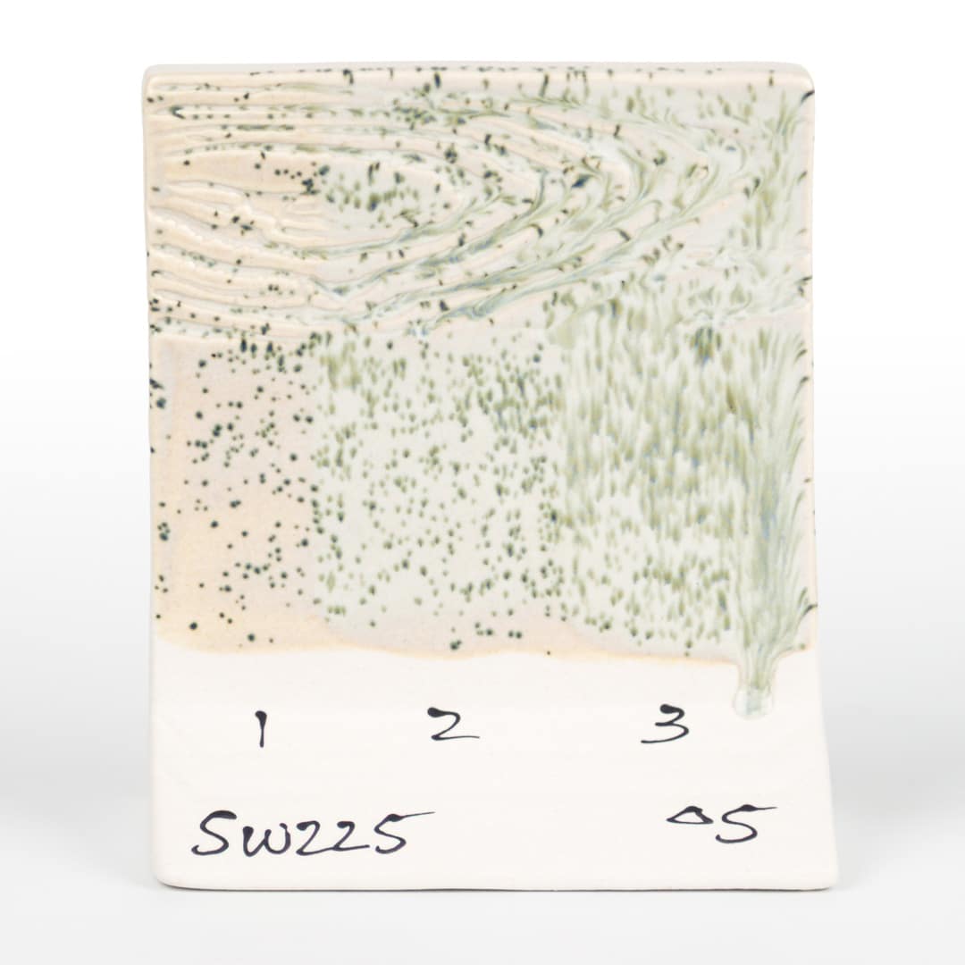 Mayco SW-225 Lily Pad is a glossy, transparent white glaze that breaks over texture. Contains green specks. Stable glaze. Mayco’s Stoneware glazes are formulated to be friendly to the user in application and firing. Many glazes will break over textures, revealing secondary colors and shades. Used alone, stoneware glazes produce beautiful color variations.