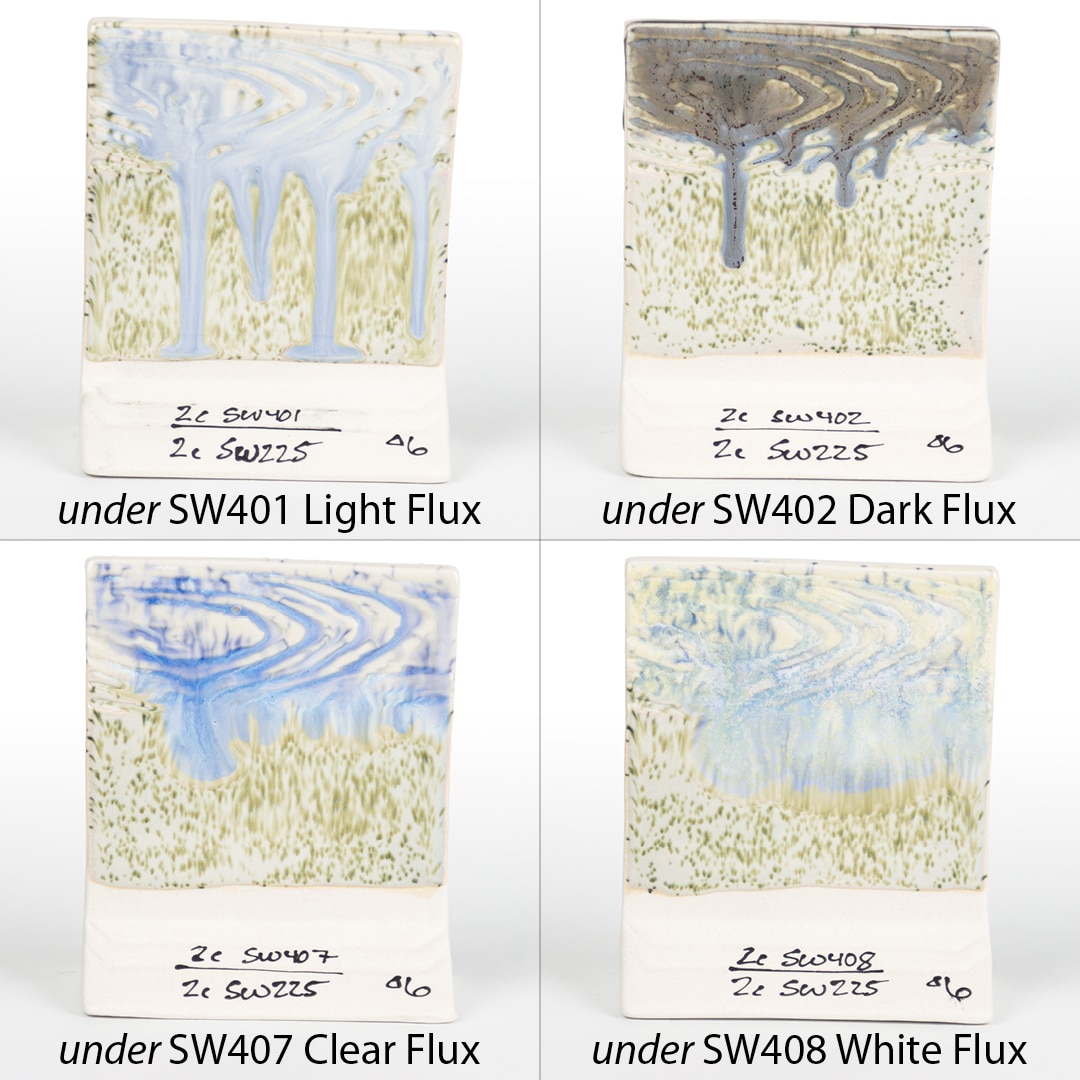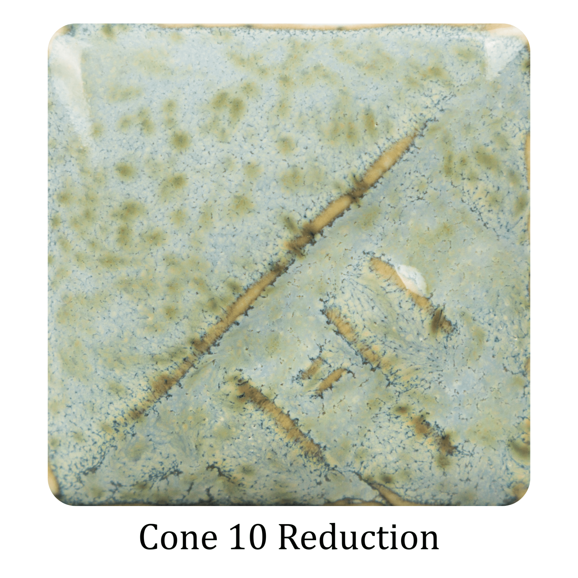 At cone 10 Lily Pad changes to a glossy blue. Heavy crystal application may effect color results and movement.