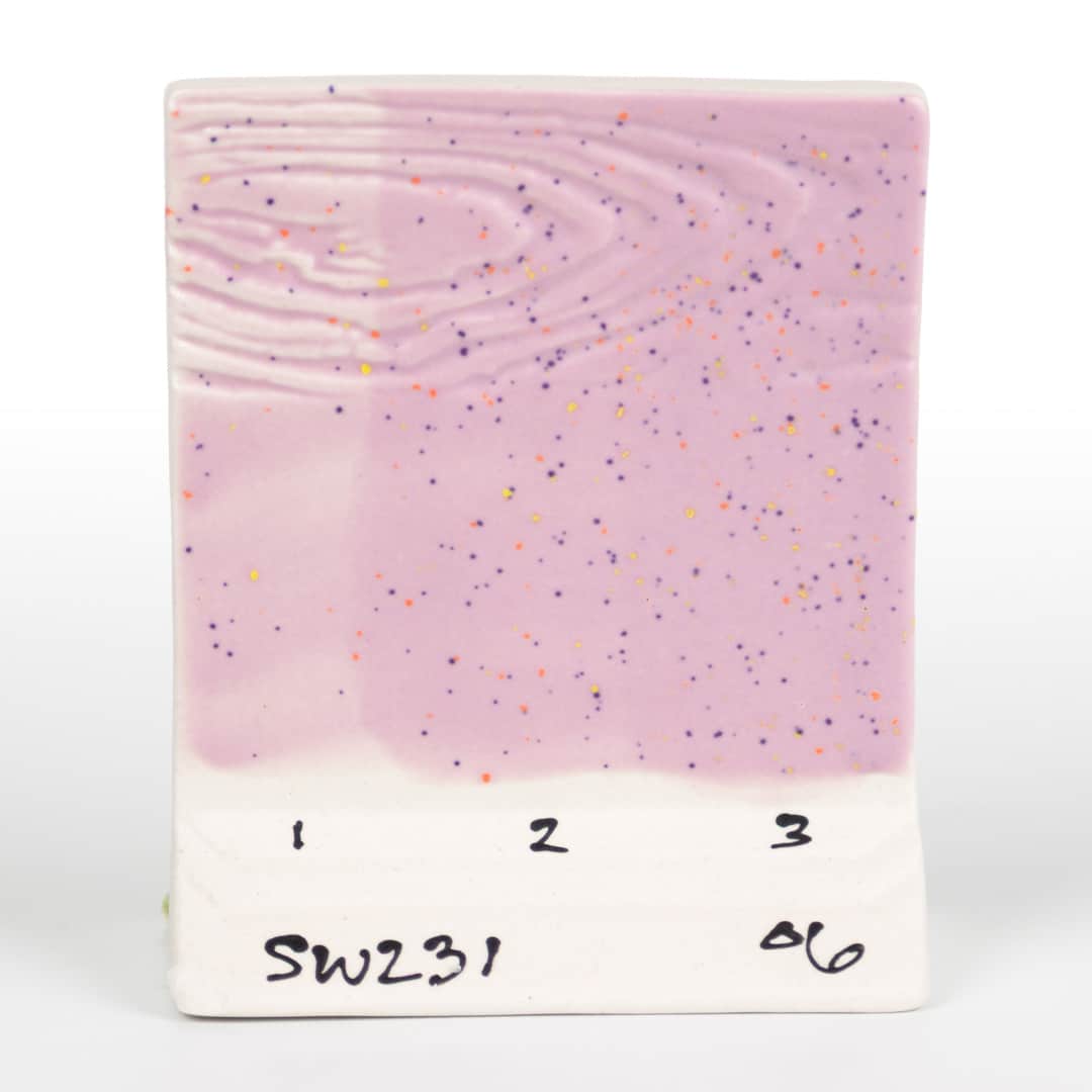 Mayco SW-231 Lilac Speck is a Satin-matte, semi-opaque light blue that breaks over texture. Contains small purple, orange and yellow specks. Stable glaze. Mayco’s Stoneware glazes are formulated to be friendly to the user in application and firing.