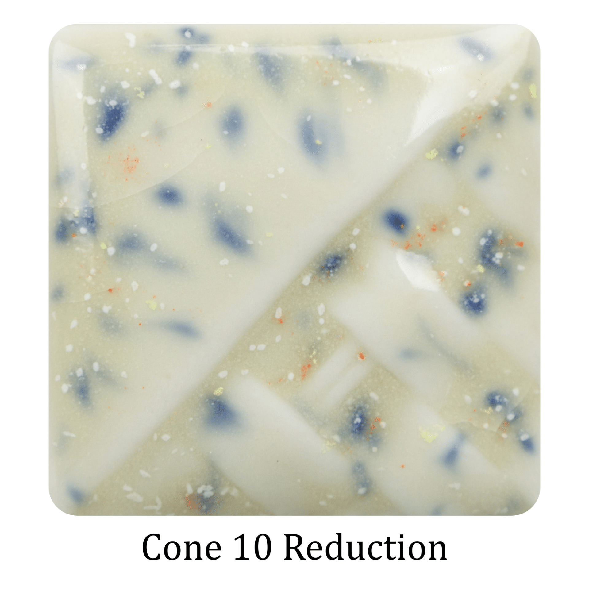 At cone 10 Lilac Speck lightens to off-white. Specks blur and lose definition with increased application thickness; crystallization may develop. Remains stable.