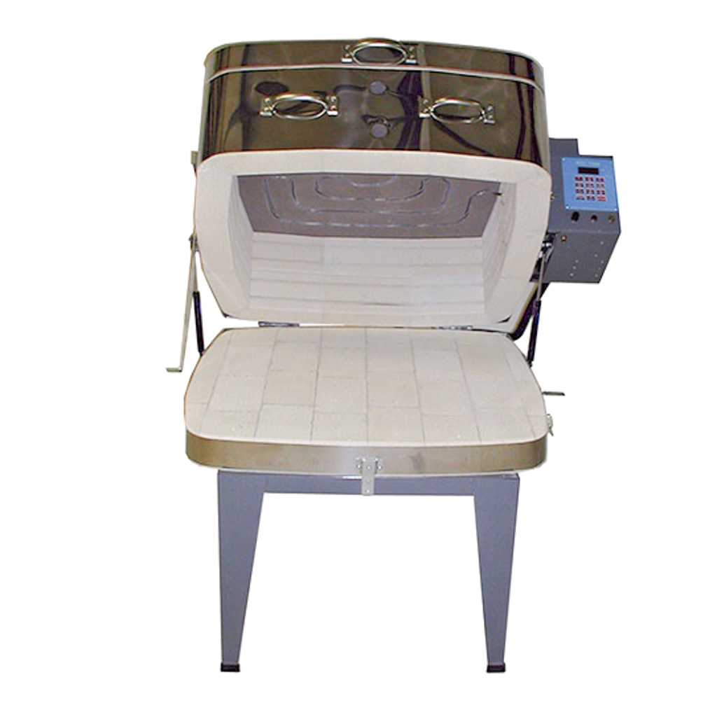 The GF3ETLC’s square design expands the firing space provided by traditional cylindrical glass kilns and with its unique top and clamshell loading feature, you get two kilns in one! Flash venting, glass raking, and loading shelves with glass positioned are easy and convenient with the clamshell loading feature. The model has an element in the lid of the kiln to provide radiant heat needed when fusing temperature is reached and elements in the kiln walls for conductive heat. Elements in the firing chamber are used to evenly heat the glass piece and the lid element is used when fusing temperature is reached. Models have a maximum temperature range of 1700°F to protect the optional quartz glass viewing window but can be reprogrammed to fire to higher temperatures. 240-208-volt glass fusing kilns come equipped with pilot light, come with a tall 18” metal stand or frame, stainless steel jacket, and Bartlett 3 Key electronic controller. Controller data is entered by scrolling through the up and down arrows for the desired temperature for ramp/hold programming. Included in the kiln package are peephole plugs and instruction manuals. Two-year Kiln Limited Warranty. INSIDE DIMENSIONS: 25″ X 25″ WIDE X 9″ DEEP, FIRES TO 1700° F